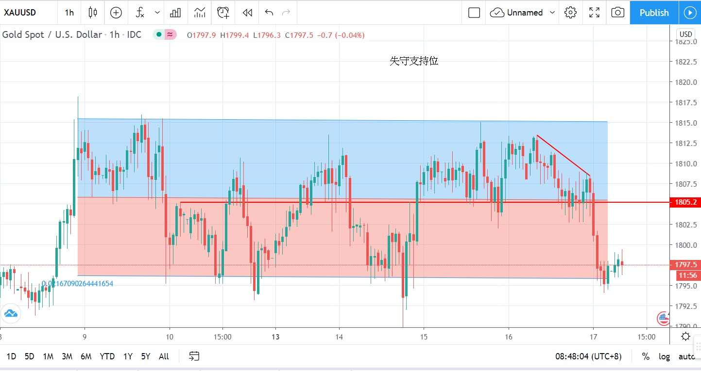 顯示美國失業情況仍然嚴重。數據公布後金價初時仍在1805美元上下爭持,在美元指數上升壓力下,逼使金價下跌,最終未能守穩這支持點而急轉下跌,