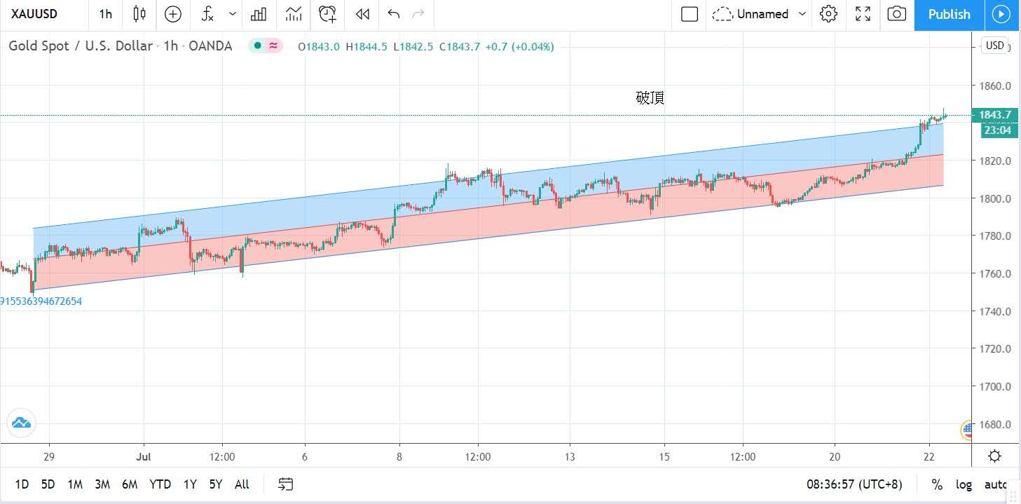 美元指數走弱帶動金價上升,金價昨日再創八年多來新高,亞洲開市時段即反覆上升,待升破1825美元後則直破1840美元,最高曾升至1843.5美元,
