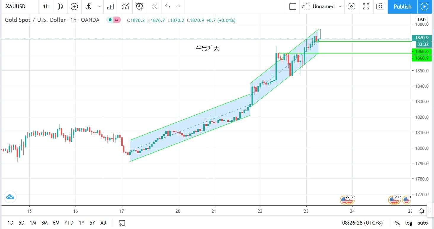 金價亞洲開市即牛氣沖天,直上1865.8美元,先破今年高位,在美市時段因地緣政治緊張關係而接力上升,以昨日最高位的每盎司1872美元報收,昨日波幅幾近31美元。