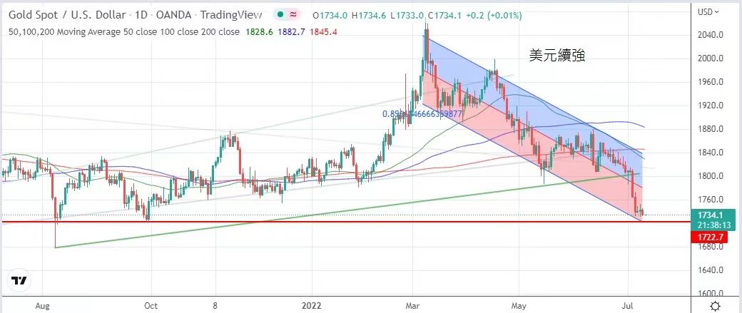 避險工具,美元指數昨日曾升穿108點,迫近20年以來高位,金市無奈受壓,金價最高見1744.6美元後,最低見1731.3美元,