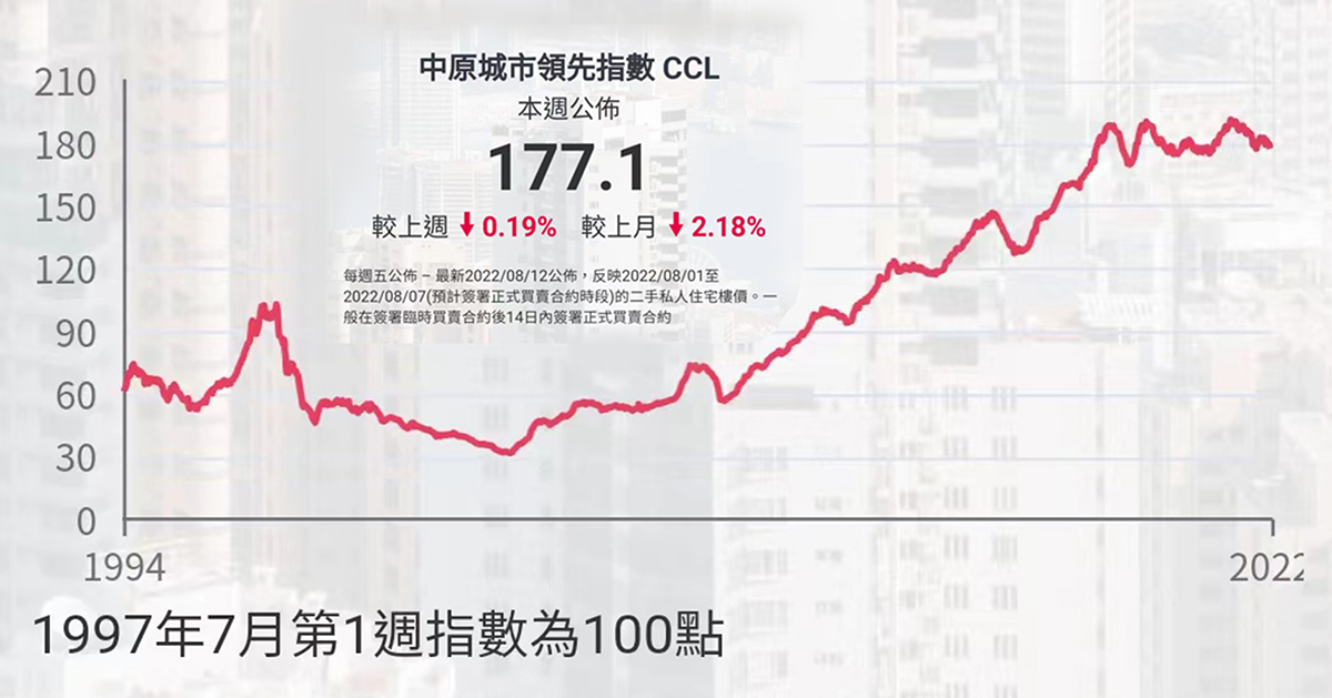 市大學商學院管理科學系編制,數據取自香港一百個大型屋苑的二手成交,逢星期五公佈一次。指數於1997年7月時定為100點,