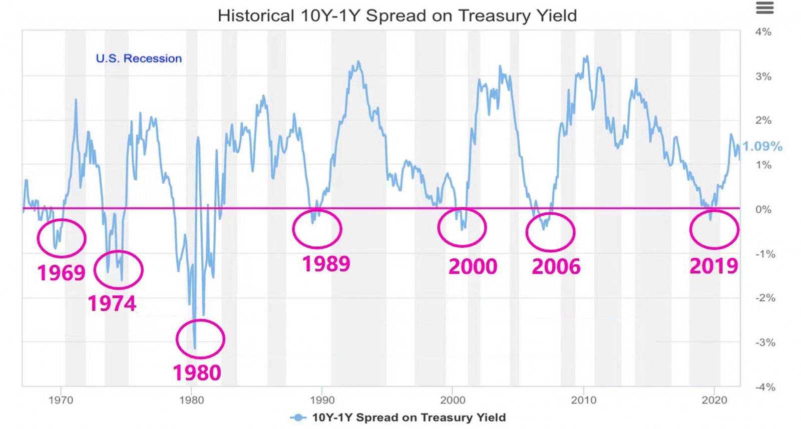 債息倒掛,亦即短期債息高於長期債息️,被市場視為是經濟衰退先兆,在過去50年,幾乎美國每次經濟衰退前都出現債息倒