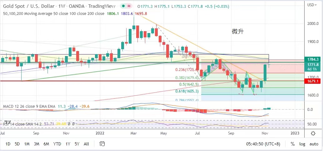 暗示將放緩加息步伐。消息支持金價反彈,最高則升至1775.1美元,最後以1771.5美元收市,微升0.2美元。