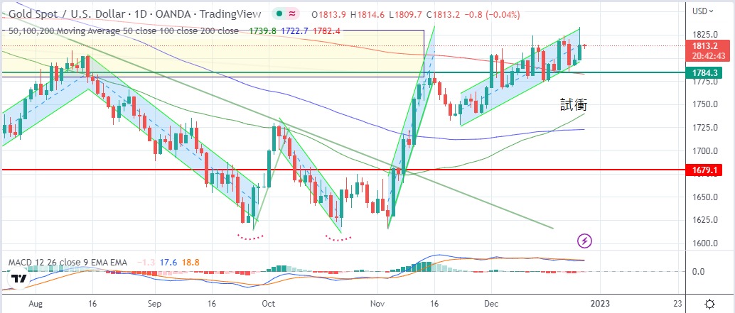 不出限制區域若1780至1820美元區域,預期在本年度結束前,亦復如是,見高可空。今日建議波幅1802美元至18