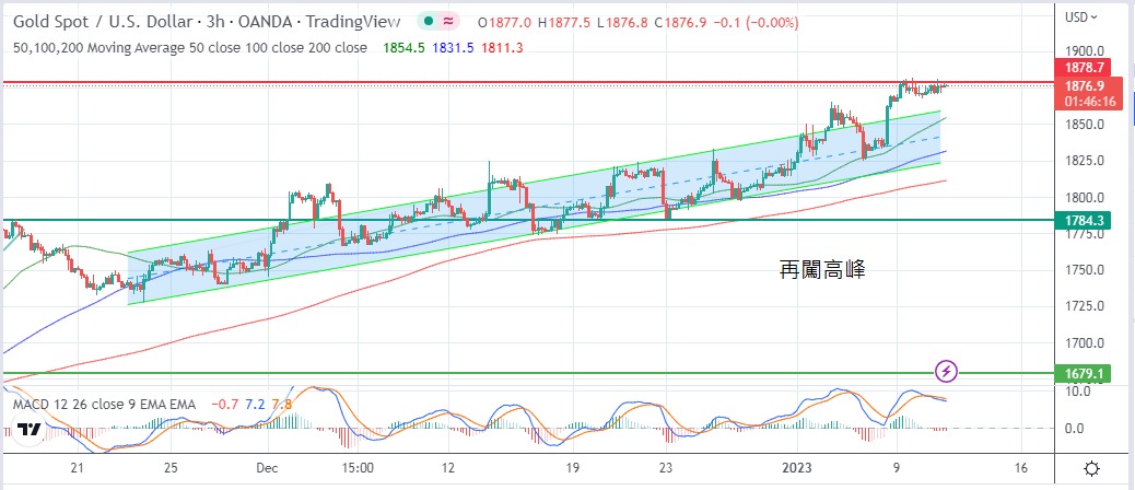 市場關注昨晚聯儲局主席鮑威爾在昨晚的講話,但他沒有對聯邦基金利率作出任何評論,市場鬆一口氣,美元稍為回軟,金價向上修正。金價衝擊1900美元只是時間性問題,三小時圖出現小圓底,今日再創本年高位可期。今日保留昨日建議波幅1868美元至1888美元。