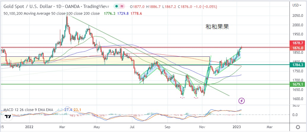 1886.7美元,但美股開市上升,打擊了金價的漲勢,金價在美市時段開始下調,最低見1867.2美元,最終以1876美元