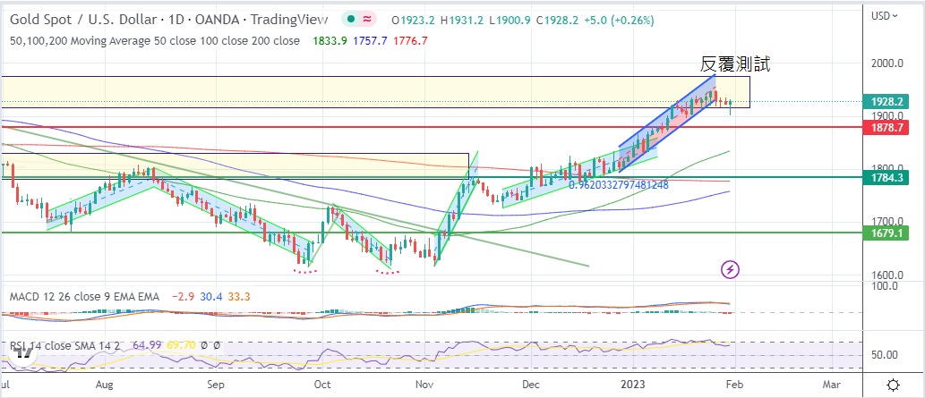 凌晨落實加息0.25%的政策,並相信加息周期將在今年完結,金市跌近1900美元後來個V型反彈,再次顯示金價