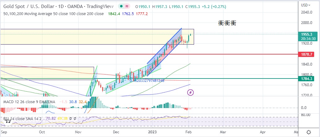 一如市場預料,美聯儲受制於近期較差的經濟數據,為免用力過重造成硬著陸,今晨宣布加息25點子,之後鮑威爾放軟口風,在議息會議後表示今年將會暫停結加息,立時引爆市場,金市衝擊1950美元,與2000美元關口越拉越近。今日建議波幅1948美元至1960美元。