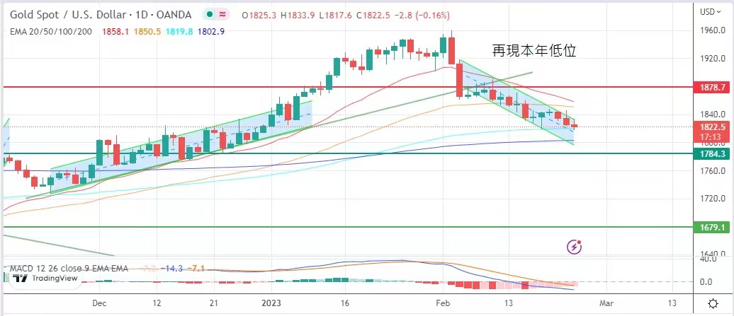令市場憂慮聯儲局不得不向上修正加息政策,金市受壓曾見本年新低,最低見1817.6美元,最高曾見1833.9元,以