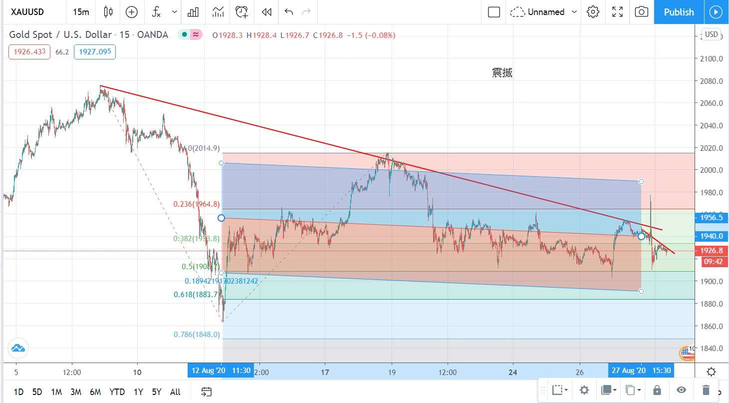 受美國聯儲局主席鮑威爾年度講話影響,導致美元大幅波動,昨日金價亦在該時段大上大落,最高見每盎司1977,最低見每盎司1910美元,