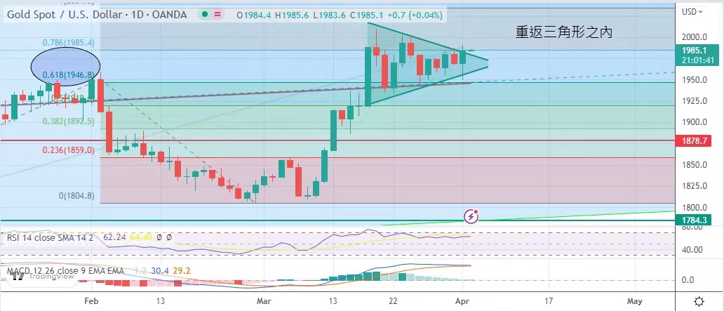 的製造業作反彈,再次挑戰1990美元,市場等待美國勞工數據表現, 三角形上方邊緣的1980美元成為關鍵,跌穿