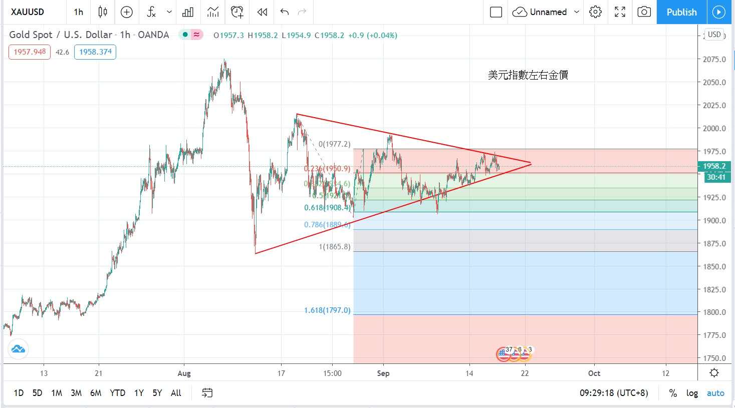 但美國上週原油庫存減少4.39百萬桶則勝預期。金價昨日高位震盪,美元早段走弱,金價最高見每盎司1974美元,但美國股市再度震散了金價,