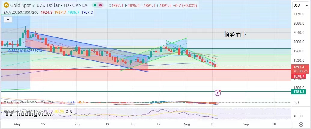 1900美元水平收市,金價消耗式下跌,空頭仍繼續主宰著金市。今日建議波幅於1884美元至1901美元。