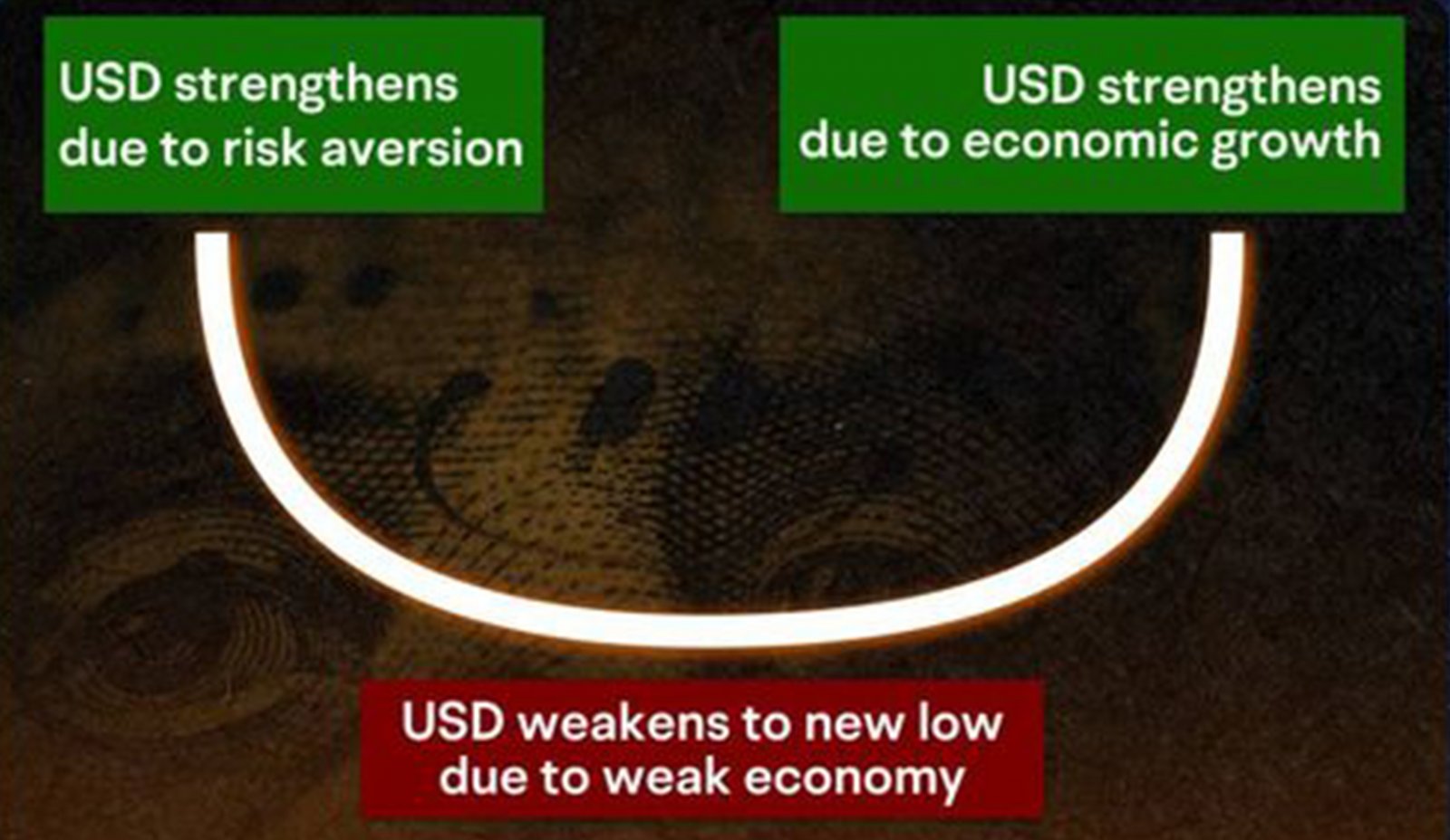 「美元微笑」是由知名經濟學家Stephen Jen提出,將美元走勢形容為一條笑臉曲線這條曲線展示了美元匯率在三種不同經濟狀況下的表現: