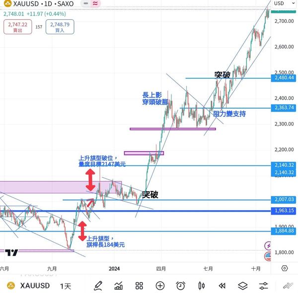 上週市場繼續追逐黃金市場,除了環球市場開始寛鬆貨幣政策,有利金價發展外;中東局勢緊張及美國大選臨近,亦令資金靠岸於黃金這資金避難所。週初時間已見金價震盪上升,直至週三早段升至2758,連續五個交易日創出歷史新高。