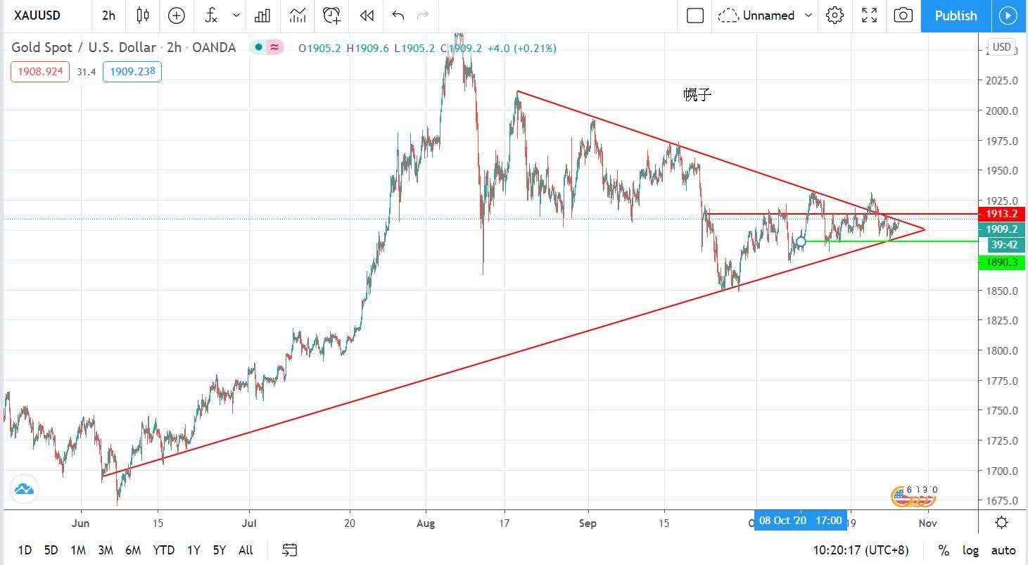 將金價的升勢回拉,最差曾跌破1900水平見每盎司1892美元,投資者在美國總統選舉有結果前,投資者策略更趨保守,難有大上大落的市況。