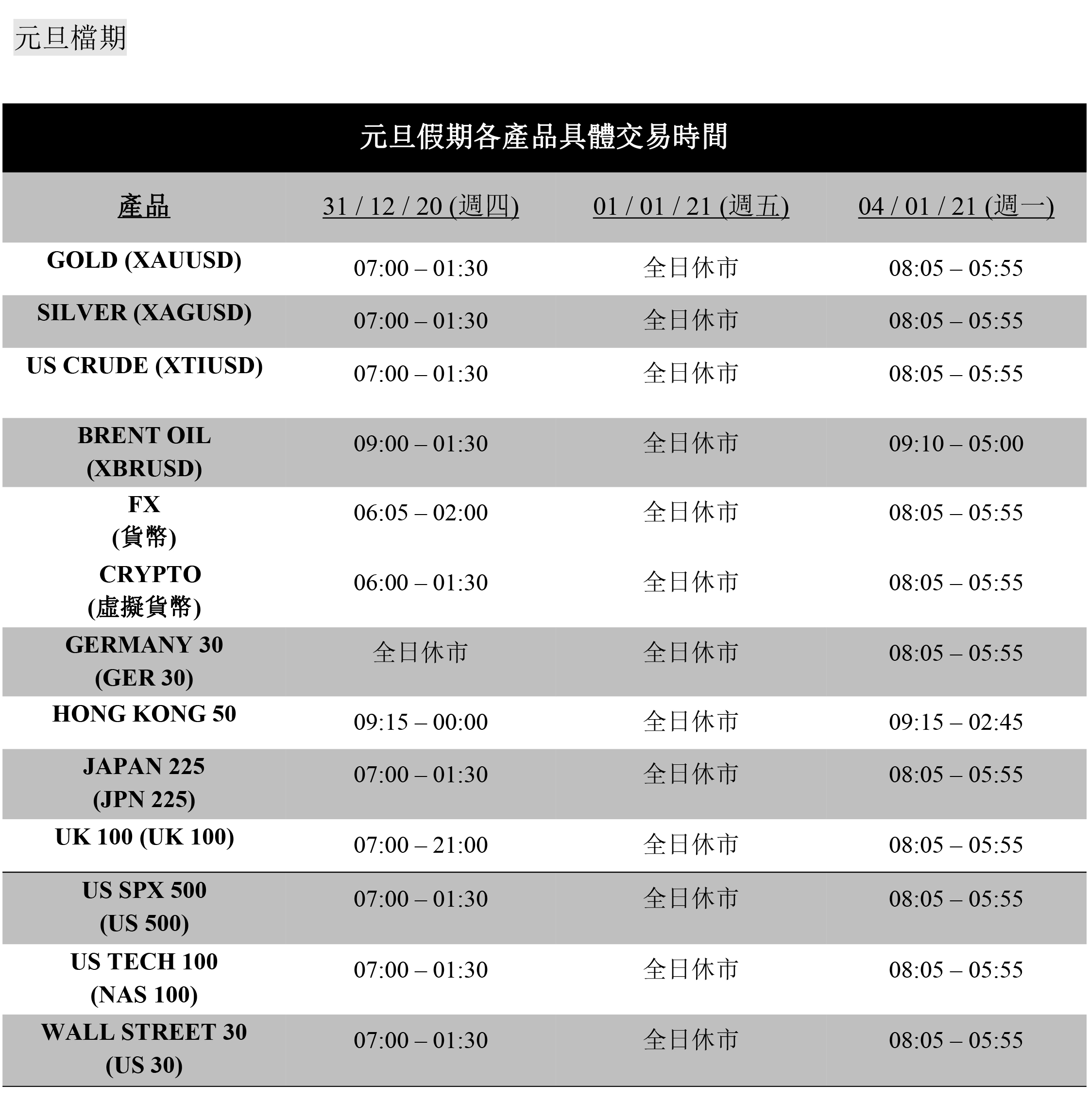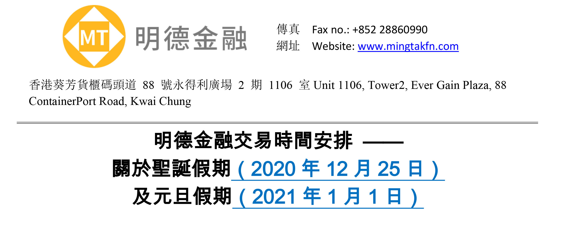 明德金融交易時間安排 — 聖誕假期以及元旦假期