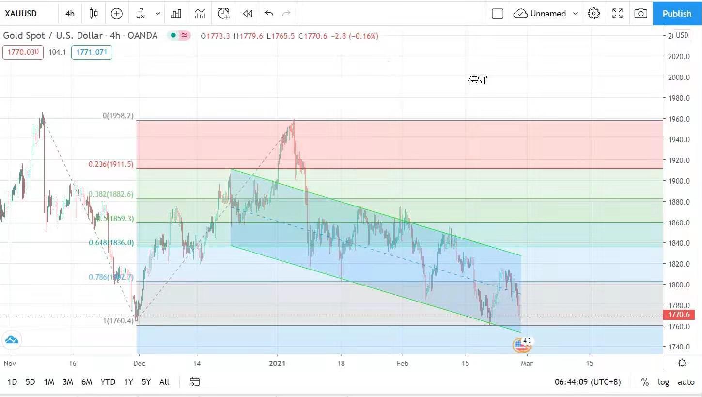 標準普爾指數跌1.73%;納斯達克指數跌2.43%。美元指數昨日轉弱,曾一度跌破90點水平,美元弱勢原有利金價向上,無奈美國10年國債價格下跌,
