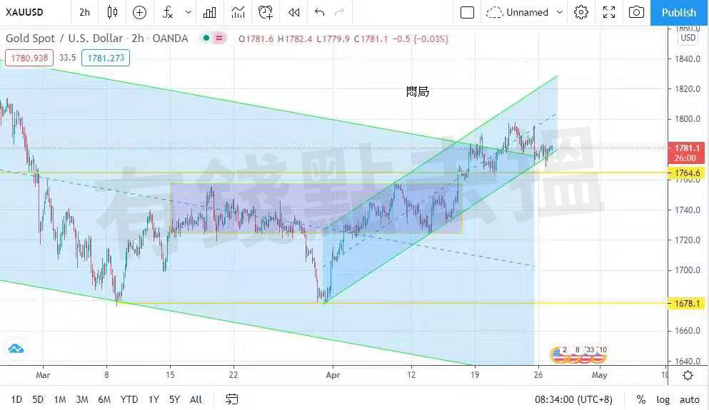 至美市開市公佈上月耐用商品訂單增長遜預期,金價曾一小時間下跌至低位1769美元,但又急速反彈至1783美元,以1781美元收市,升4美元。