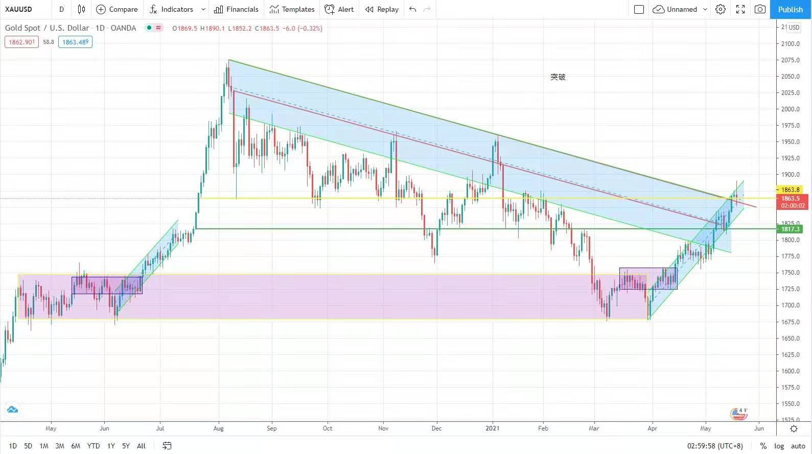 但如果經濟繼續快速增長,會在「某個時候」開始討論縮減購債規模將是合適的。 美聯儲措詞觸發金市調整,最終以1870美元收市,