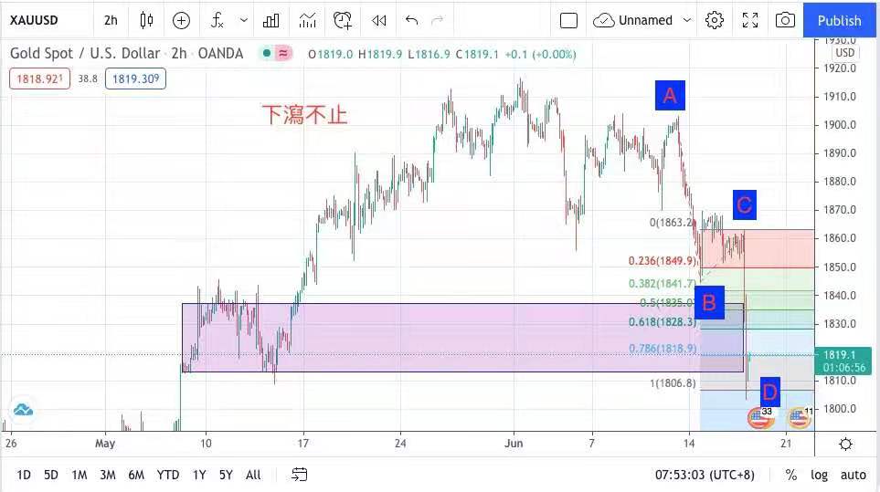或要考驗1844美元的支持。但想不到這個支持位如此不堪一擊,金價直程下瀉不止,跌至費波黃金比率1比1(AB=CD)才有些微反彈。