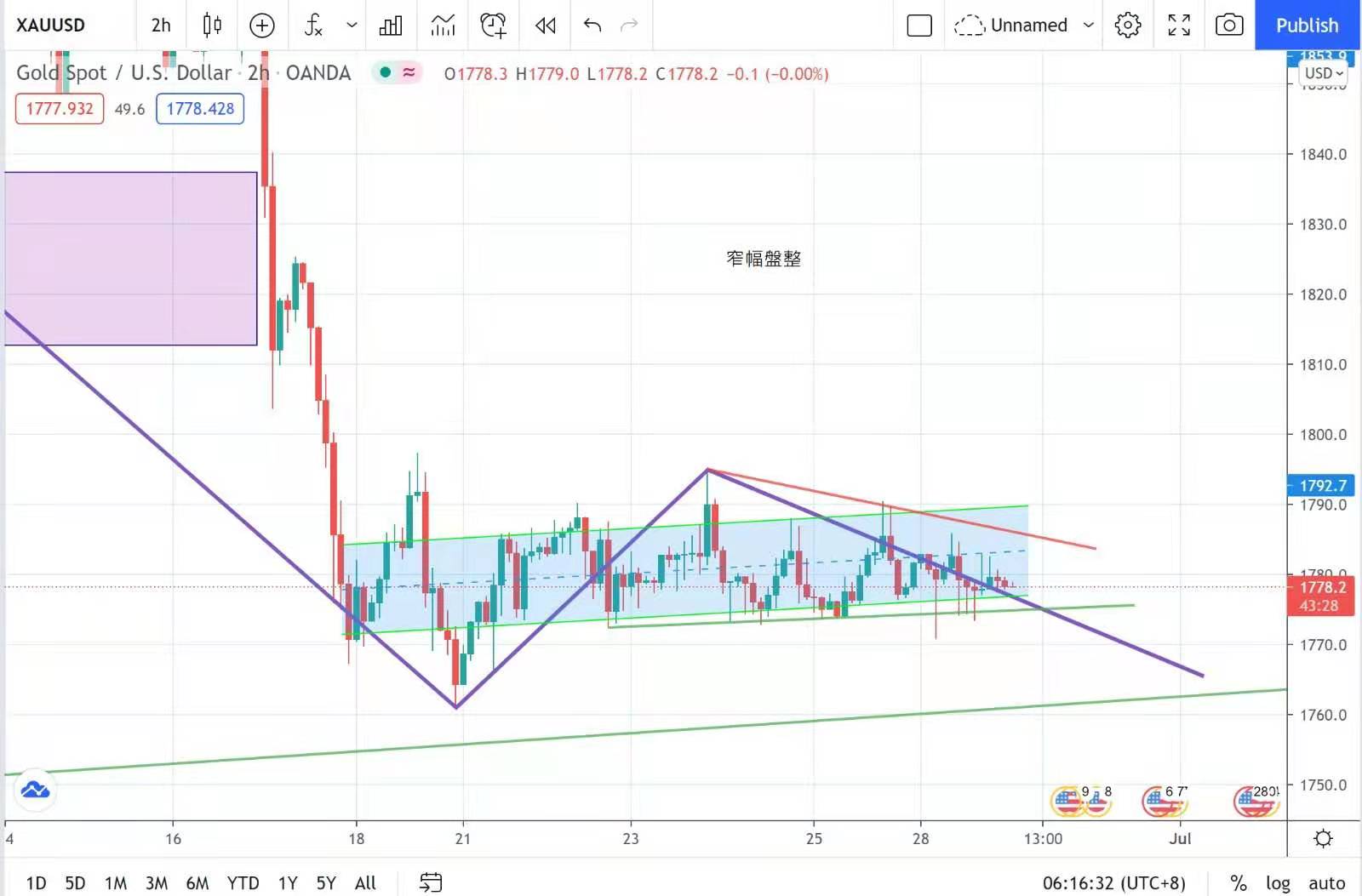 金市昨日仍是震盪格局,昨日開市金價從日高位的1786美元輾轉回落至日低1771美元,昨晚美國公佈6月達拉斯聯儲商業活動指數不但倒退,還遜於預期;數據彷如向經濟復甦之火苗潑冷水;金價多頭投資者亦曾嘗試反擊,但明顯受制於1780美元,最後報1778美元,跌4美元收市。