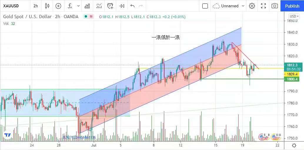 昨日收市雖然錄得升幅,最終仍是企在1812美元的轉折點不遠,美聯儲將於在本月29日凌晨2時宣佈議息,預料在7月分議息日子前,