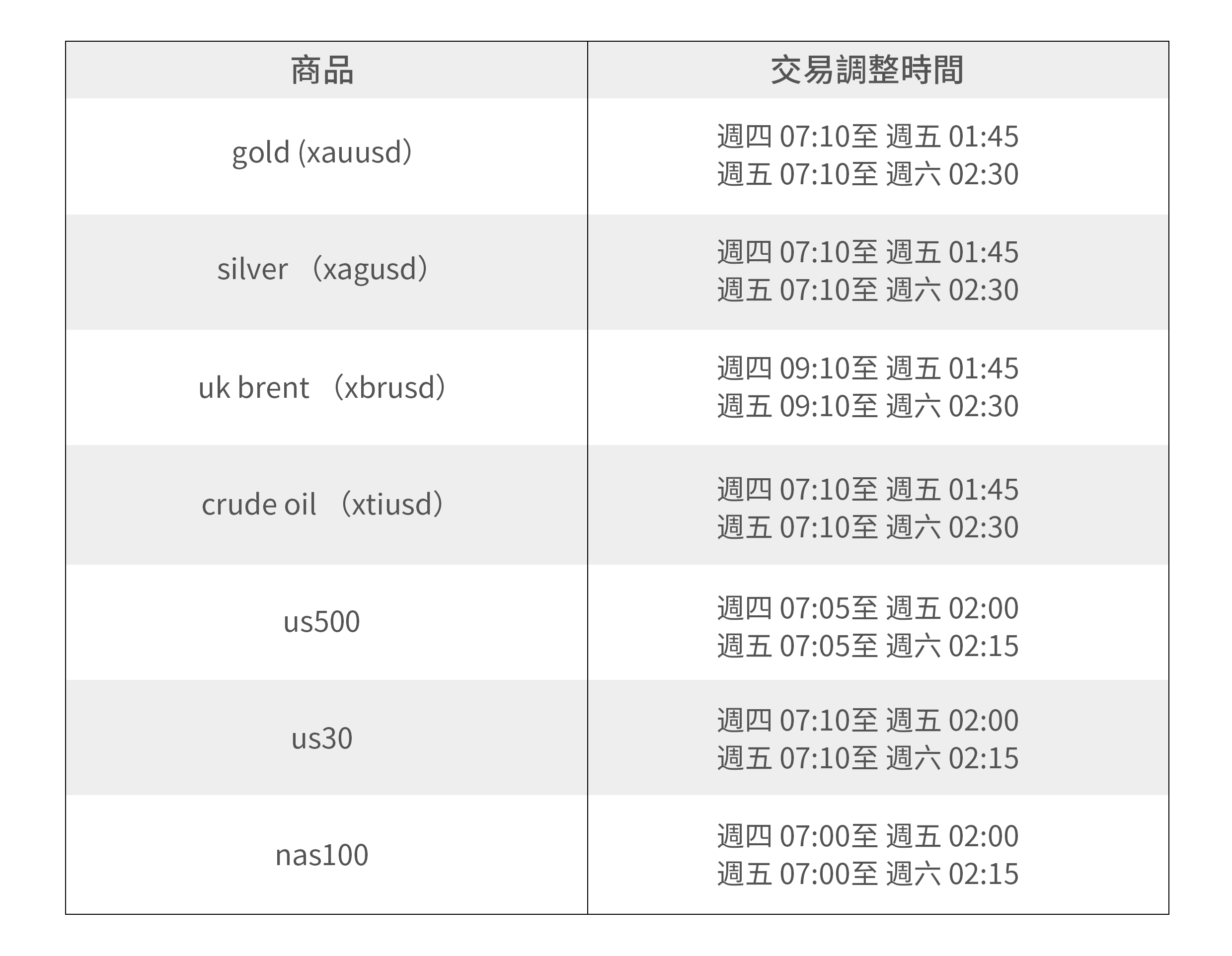 請注意,由於感恩節假期即將來臨,明德金融部分商品交易時間將有所變動,以下交易時間適用於2021年11月25日(星期四)和2021年11月26日(星期五),以下時間均為北京時間(GMT+8):
