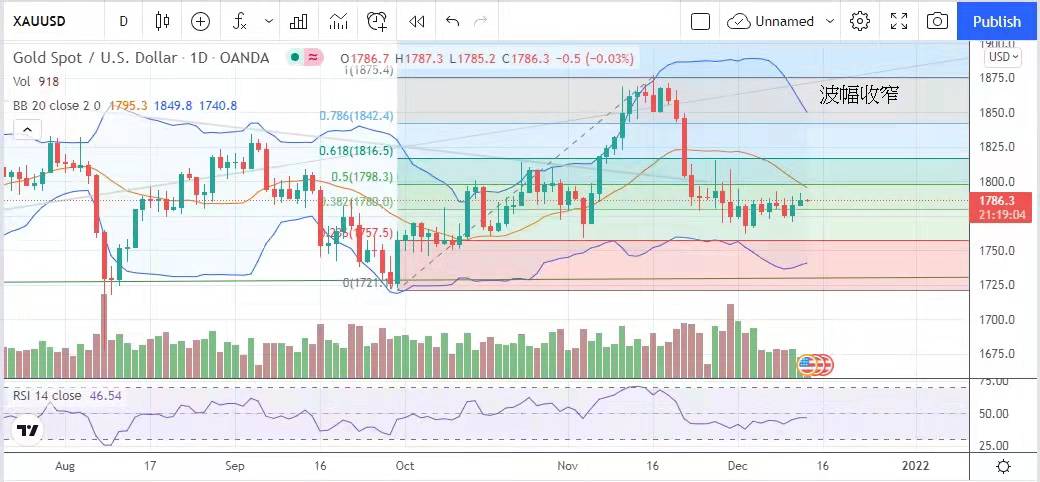 在明日零晨開始本年度最後一議息會議,市場預料美聯儲加快取消債券贖買計劃,限制金價升幅。金價仍明顯欠缺方向,預期短期仍將在1760至1800美元