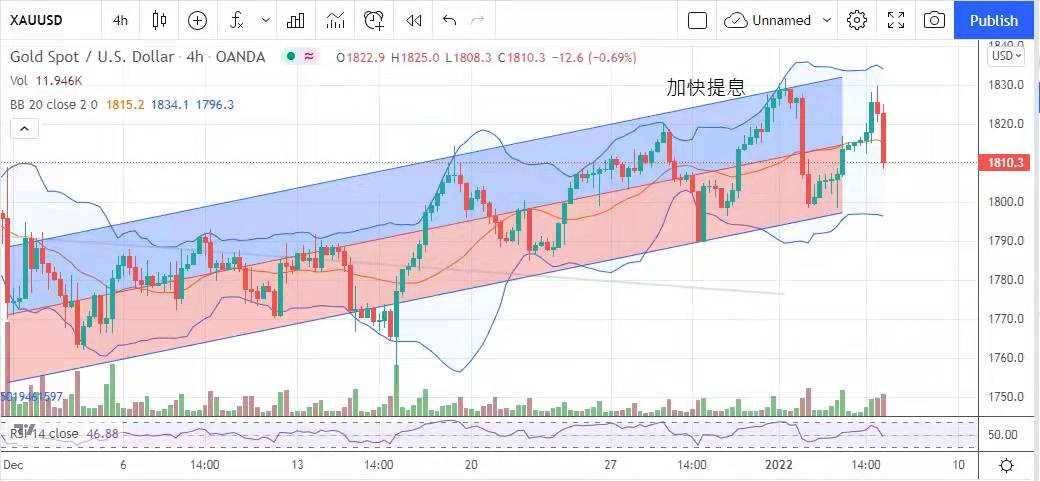 金價曾升升至高位的1829.6美元,但美聯盟儲公布上月會議紀要,顯示加息步伐將加快,十年期國債升破1.7%,金價被打壓,金價最低見1808.3美元,收市報1810.3美元,