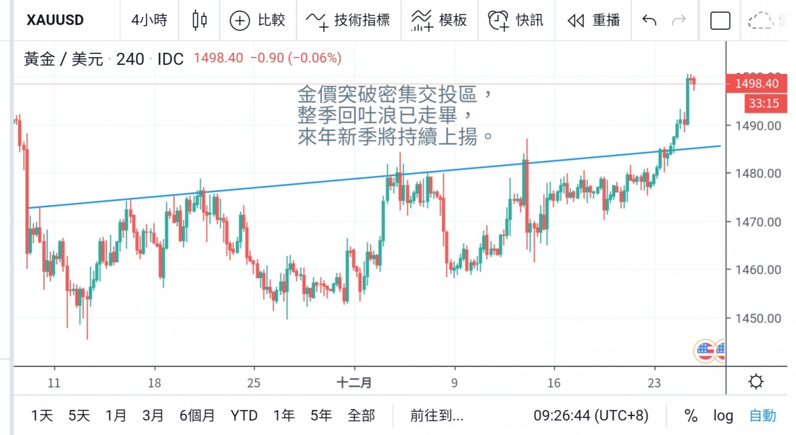 唯獨金市於假期前夕,仍然發力向上,金價於平安夜,幾乎是直線向上,從早上1484起步,美國市前已突破1490上方並企穩;