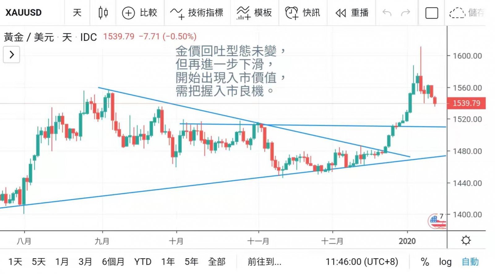 金價如期回吐,今晨續跌低至1535美元,,跌勢才稍見放緩,金價自高位回落近80美元,亦開始出現低吸良機。