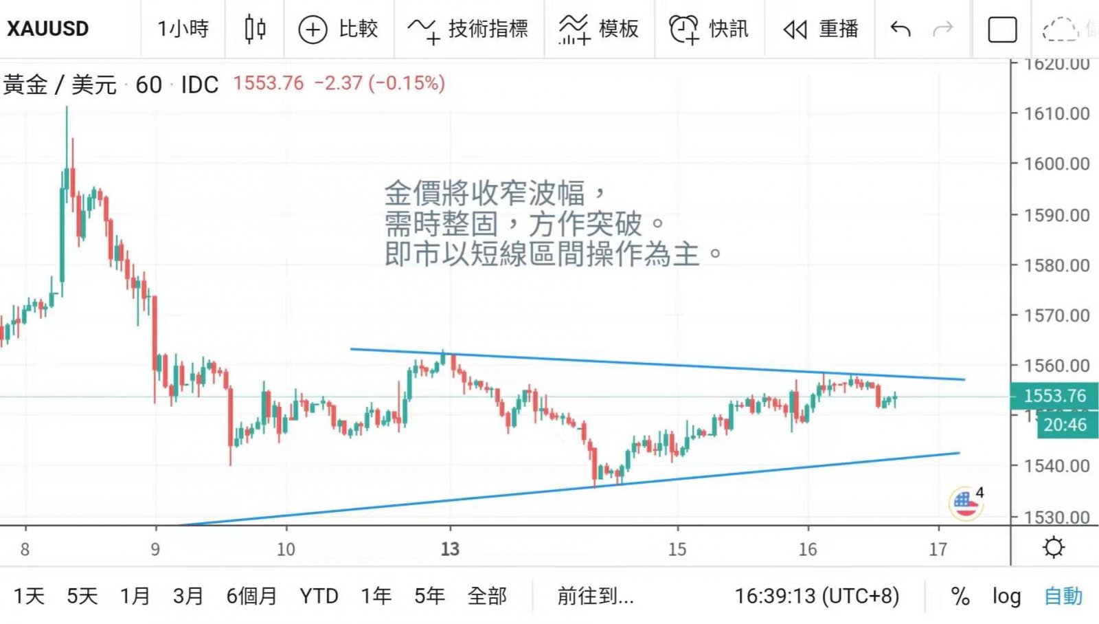 低位反彈後,亦可於近1560位置沽空,在整固多一輪後,金價方能獲足夠動力突破。