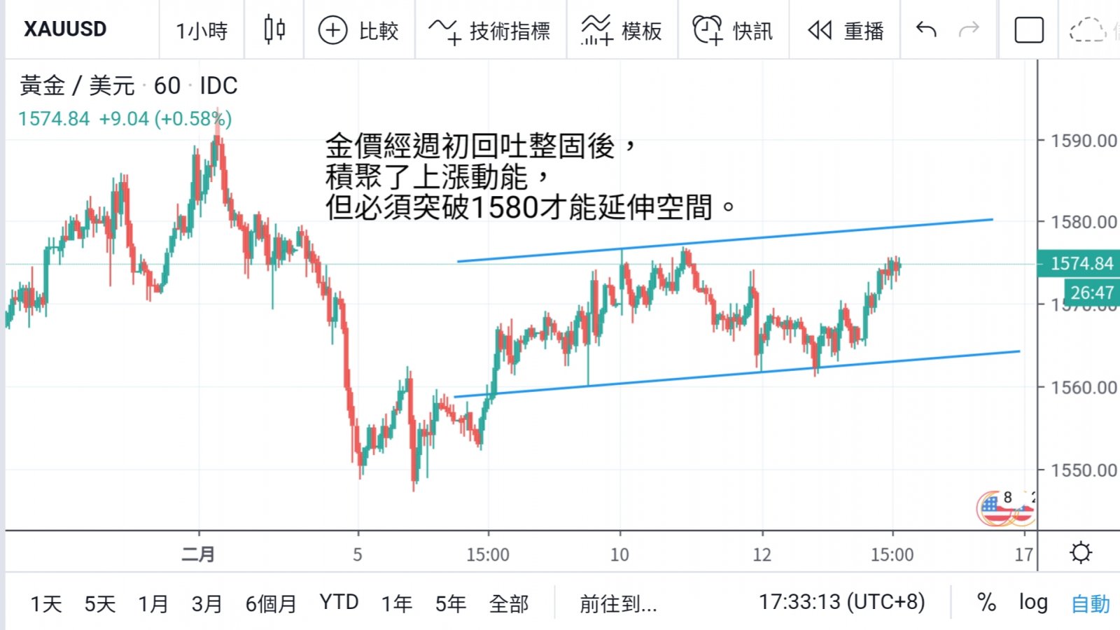 整固兩天後,要視乎金價能否突破1580關口,若能上升則可延伸上升空間,否則金價的整固區間不變,但下方支持將逐步提升。
