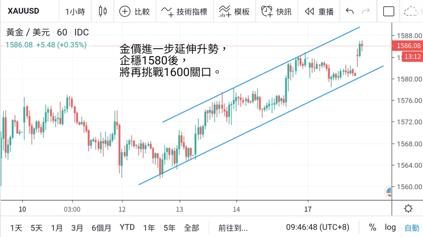 今晨甫開市,金價便再度上揚,再創月內高位,金價只要一直企穩於1580上方,保持上漲動能,快將挑戰1600心理關口。
